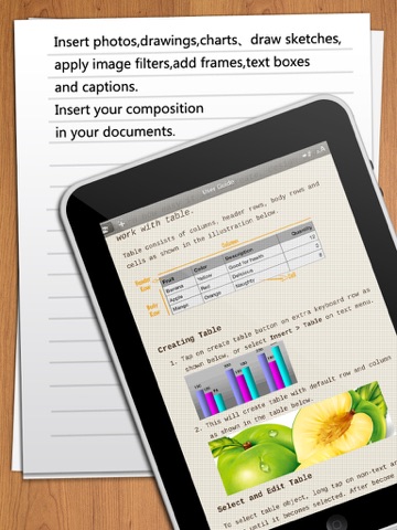 • View and edit RTF documents, HTML and plain text files; easily import files from Mail, the web, or your Mac or PC using iTunes File Sharing