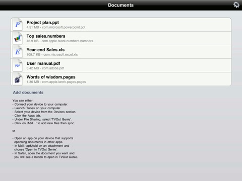 If you are looking for more ways of mirroring content to your Apple TV (including Browser, Maps, Photos, Facebook Photos and Text Notes in addition to Documents), have a look at our other app "TVOut Genie!"