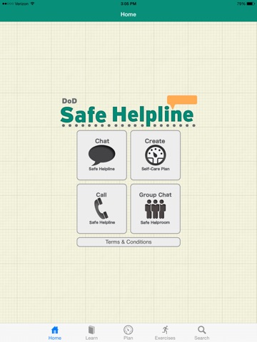 The DoD Safe Helpline app gives members of the military community access to resources and tools to help manage the short- and long-term effects of sexual assault. The app helps you create a plan that is right for you, from exercises that aid in reducing stress to tools to help you transition to civilian life. You can even store your customized plans and exercises so you can refer back to them at any time. The app has four sections: