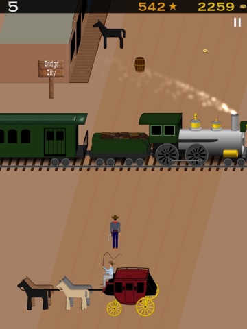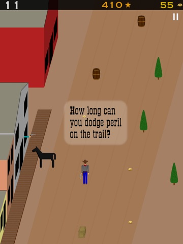 Travel along the western trail and dodge threats along the way. Dodge Trail is an endless arcade run through western towns, past steam train routes and pioneer wagon trails. Collect gold nuggets as you travel. You can use gold nuggets to get sheriff badges. As a sheriff, each badge will protect you from a conventional enemy weapon attack and help you advance farther. See how far you can go along the Dodge Trail.