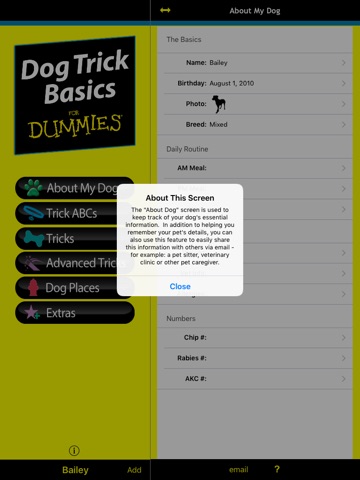 Teach your dog lots of tricks with our Dog Trick Basics For Dummies app. Youll get detailed instructions for teaching your basic tricks, such as, shake, jump, give hugs and kisses, and roll over. Plus, amaze friends and family with advanced tricks that include closing doors and placing toys in a toy box!