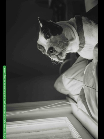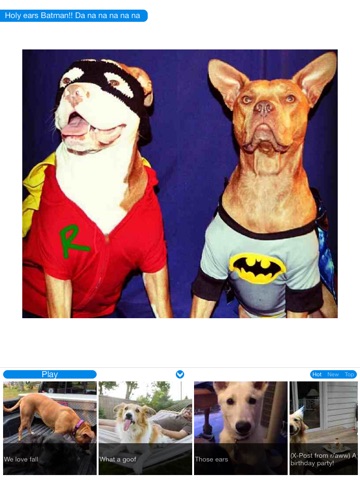Dogs! - Pics & More opens with a main image up top and a group of thumbnail below. Swipe through all the thumbnails or tap Play to autoscroll. Tap on on a thumbnail to view a detailed image. Pro users can double tap in the middle of the screen to start a slideshow and have access to over 20+ color themes! A convenient title bar is located in top left and can be hidden/shown by tapping on the top of the screen. Previous and Next buttons are added for fast image switching.
