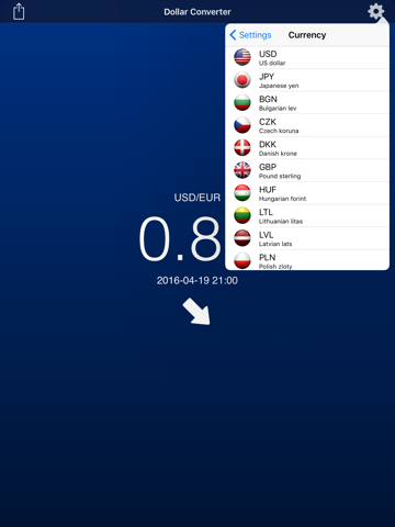 This simple currency converter displays how much 1 dollar costs in any of the supported currencies.