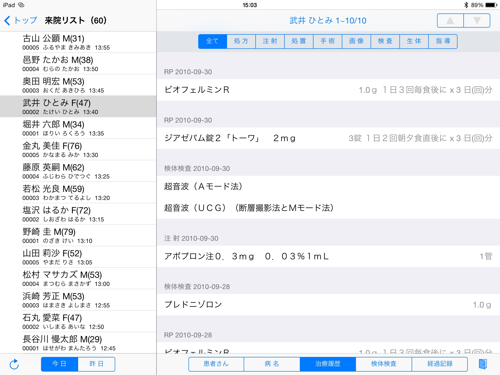 iPadは、処方、注射、処置、手術、画像、検体検査、生体検査、指導の各履歴に対応し、これらを行った順番に表示するブログライクなモードがあります。