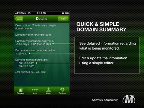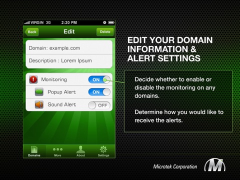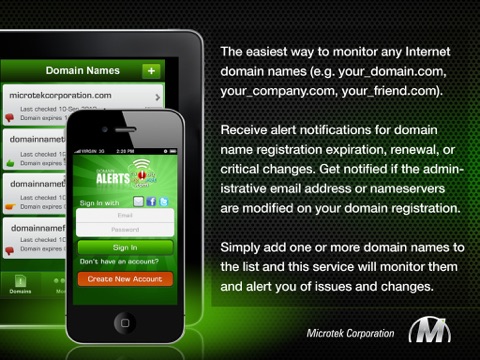 Domain Name Alerts allows monitoring of one or more Internet domain names (e.g. your_company.com) to ensure they have not expired.