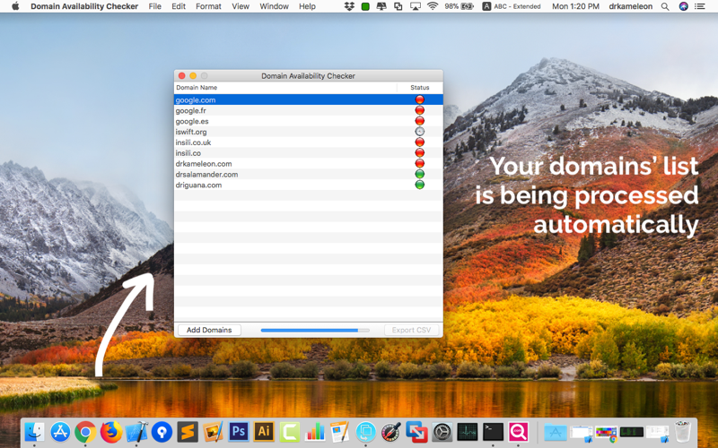 Quickly check if a list of domain names is available for registration, among many many different TLDs.