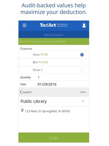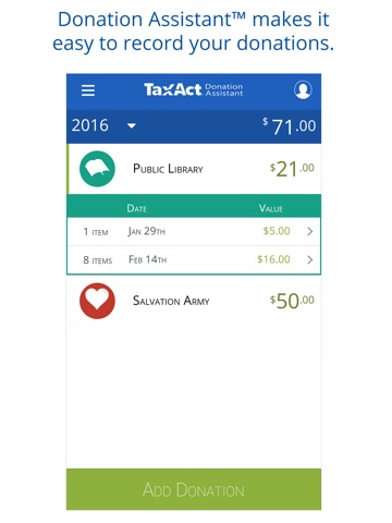 Track your charitable donations throughout the year easy, fast and free with TaxAct Donation Assistant. At tax time, just sign in to your TaxAct Account – we’ll import your donations into your tax return, help maximize your deduction, and complete your IRS forms.