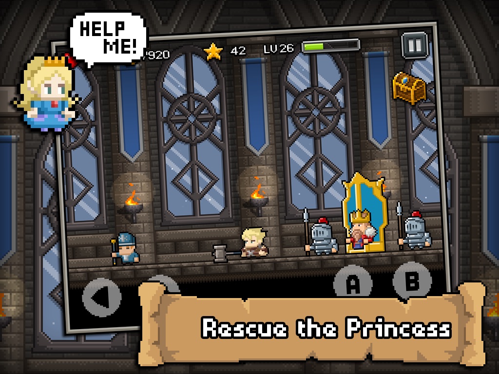Princess save the hero.The mode is super hard.The hero was captured instead of princess.Princess wears martial attire to save her hero.But,shes physical strength is limited.She need to rest when fighting.