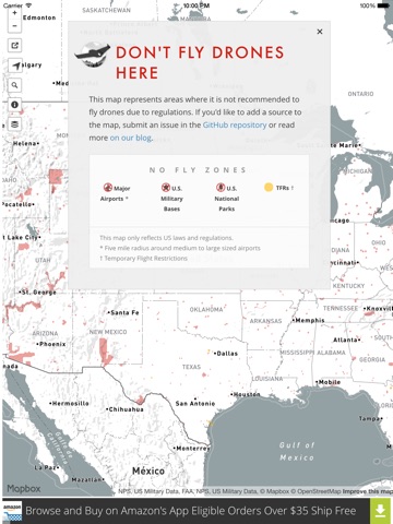 -Search for restrictions such as major airports, no fly zones, and US national parks.