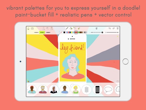 Doodles! express comes with a fun set of people sprite stickers for your use and you always have access to your doodle sprite stickers created in the original doodles! app.