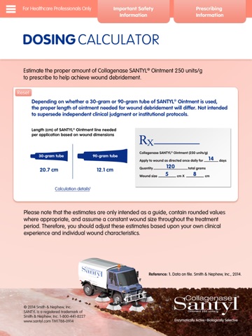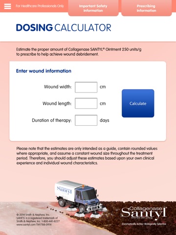 The Collagenase SANTYL◊ Ointment dosing calculator helps healthcare professionals quickly estimate the proper amount (in grams) needed to prescribe for their patients. The 4-step protocol for proper application is also included. Please note that the estimates are only intended as a guide, contain rounded values where appropriate, and assume a constant wound size throughout the treatment period. Therefore, you should adjust these estimates based upon your own clinical experience and individual wound characteristics.