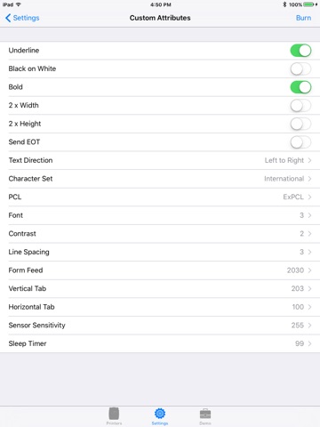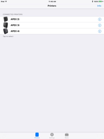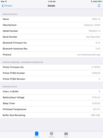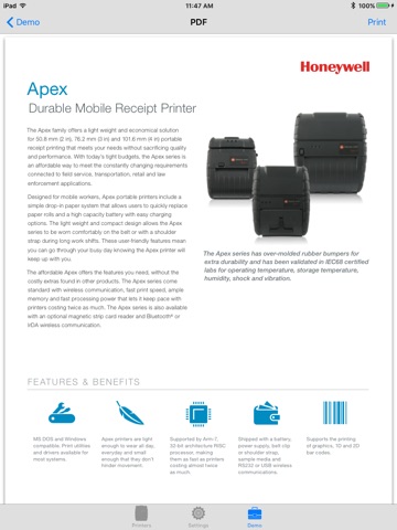 DOToolkit app was engineered to help users quickly adapt printers into their enterprise environment. The app offers several intuitive features including a module that links the Apple® iOS device to the Apex i printer, allowing it to read and display various printer statistics, such as battery voltage, timer, temperature, remaining print buffer, and other important information. The DOToolkit also includes a printer configuration utility, as well as demos for printing receipts, forms, logos and barcodes.