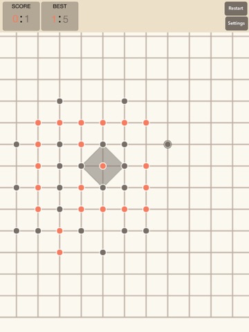 The game is played on a grid of finite dimensions. You can choose the grid size in the game settings. Players take turns making dots of their own colour. At each turn, a player must make a dot at an intersection of the grid. This dot has to be free, therefore it must not be on another dot and can not be part of a territory. You can also enclose a whole closed territory for yourself. You can make a territory of any size by making dots in a circuit that can be connected by straight or diagonal lines, one space in length. If there are no obstructions in the circuit (e.g. lines, opponents dots) then a line can be drawn connecting the dots in your color and the space inside is your territory. A line can not be drawn until the dots are able to complete a circuit. Before the line is drawn, you can intersect their line diagonally and claim territory before the opponent can.