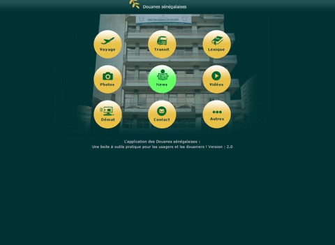 Lapplication des Douanes sénégalaises est une boite à outils pratiques pour les usagers et les douaniers. Elle a est été créée dans le but de fournir des informations clés sur les formalités douanières au Sénégal, mais aussi donne la liste de tous les commissionnaires en Douane (transitaires), lactualité continue de la Douane sénégalaise notamment en photos et vidéos, le répertoire téléphone des différents services de la Douane, un lexique pour mieux comprendre les termes douaniers et dautres informations utiles pour les usagers.