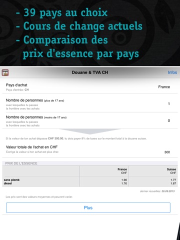 Notre application vous montre à première vue quelles seront les marchandises que vous pouvez importer sans payer des droits de douane. Elle est une calculatrice simple des droits de douane toujours à votre disposition. Elle est capable de calculer la TVA ou autres taxes de vente en vigueur dans les pays de l`Euro. L`application est avant tout qualifiée pour les achats effectués dans les pays voisins de la Suisse: l`Allemagne, la France, l`Italie et l`Autriche. En tout, les 39 principales destinations sont disponibles dans le monde entier.
