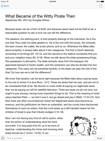 With the Douglas Wilson app youll always be only a tap away from the Blog & Mablog content. You can browse every article Pastor Wilson has posted over the years, then share it with friends.