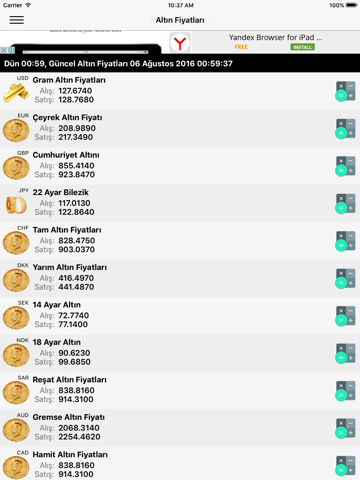 - Satışta olan altın türlerinin serbest piyasa ve banka banka alım satım fiyatlarını ve günlük değişim grafiklerini takip edebilirsiniz.