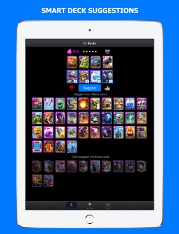 Choose your favorite cards and “Doctor Decks” will help you to find a Good Battle Deck with them. You can Rate, Save and Share with friends our suggested Battle Decks. You can be a great Clash Royale player using your favorite cards!