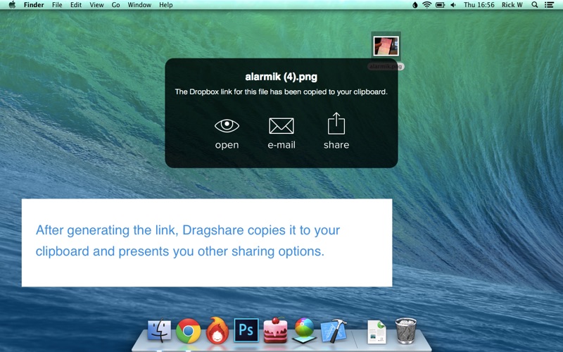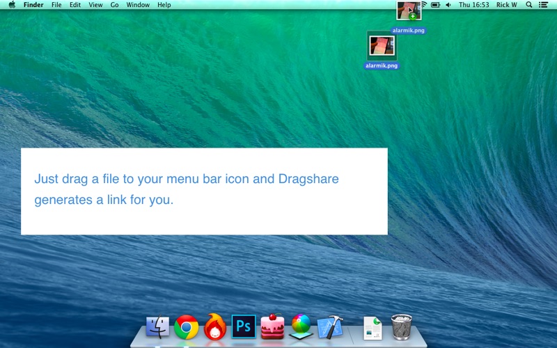 Dragshare for Dropbox is a tiny app that runs in your OS X menu bar and is connected with your Dropbox account. You can drag a file to it and it will give you a link that can be shared anywhere. No need to subscribe to another cloud file sharing service if youre already paying for Dropbox storage.