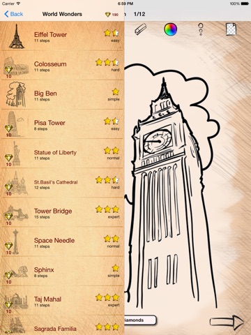 After installing Draw and Coloring World Wonders on your gadget, you’ll need to choose an interesting pattern for yourself. Then just repeat the instructions step-by-step. So the image will be created gradually. You can draw anywhere and on anything: on the school board, paper, window glass and even on the wall.