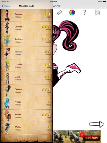 With How to Draw: Monster School Girls you can learn how to draw Dracara, Carmen, Vampie, Katara. Believe, with this application it will be much easier than you think it can be.