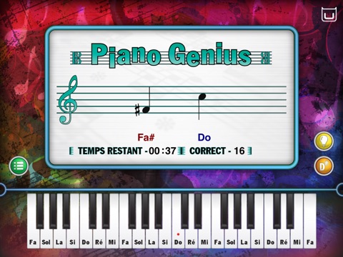 Dès que les notes apparaissent sur la portée de l’application Dream Cheeky Piano Genius, vous devez appuyer au bon moment sur les bonnes touches de votre iPlay Piano. Une aide vous propose 2 moyens d’obtenir des astuces. Plus vous êtes rapide, plus les notes à jouer sont nombreuses. En 2 minutes vous saurez si vous êtes un génie… ou pas !
