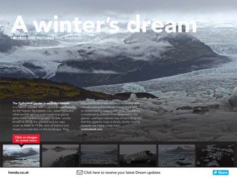 Dream is Hondas quarterly magazine, but its not just a magazine about cars, or bikes, or even lawnmowers for that matter. Dream reflects Hondas unique vision through features, stories and profiles around technology, environment, heritage and culture. Dream encourages readers to embrace Hondas inspiring philosophy that when you dream, anythings possible...