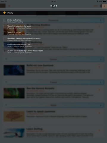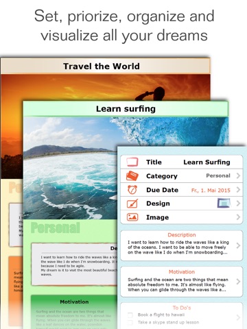 Nutze die App zum Umsetzen von Zielen. Die App denkt die wesentlichen Bereich hierfür ab. Gut gemacht!
