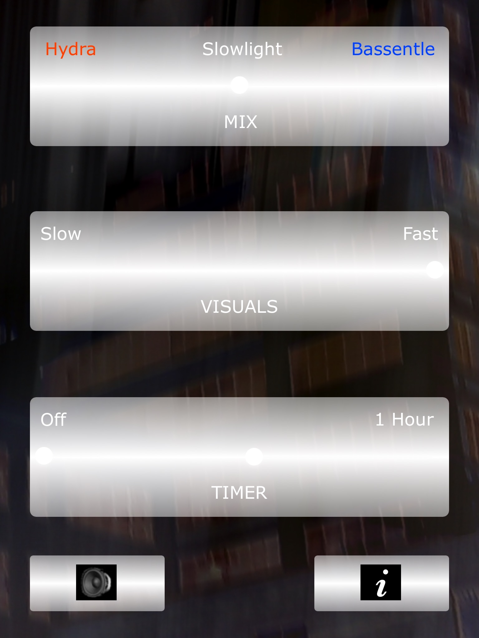 - The Control Panel gives you the option of adjusting the music mix and the speed of the visuals.
