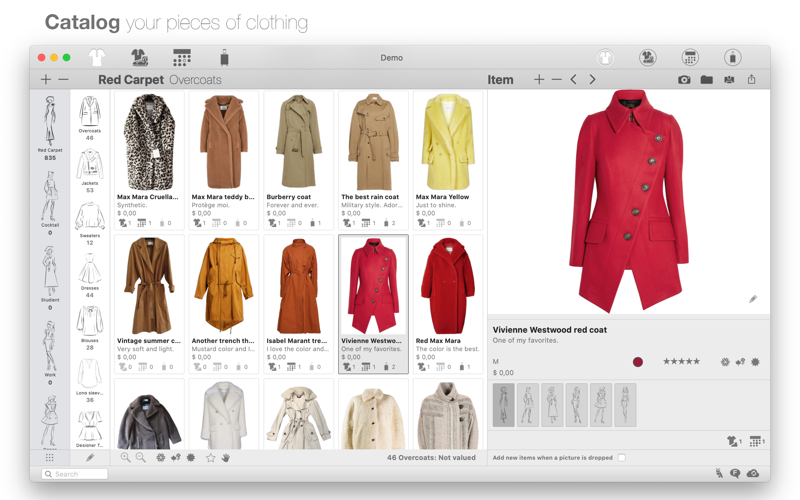Ive tried out a couple of similar apps on my iphone but was always a little disappointed because the screen size was so small. Ive just started to play with this, but right now, it seems to be the best of the batch. * With each item, you can indicate size and season, making sorting and filtering super easy. * Because it is on a computer, rather than an iphone, photos are big enough to actually get a sense of how the outfit looks together. * Love ability to track which outfits were worn for big events with calendaring function * Packing list allows you to remember what you took for a trip and just replicate what works for the next one. * Can select from a variety of colors and sort and filter. To make this work, you have to photograh your wardrobe. Once it is done, it is really helpful to keep track of what looks work across seasons. Huge time savings. Highly reccomend for folks looking for a wardrobing app.