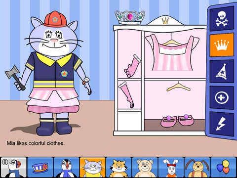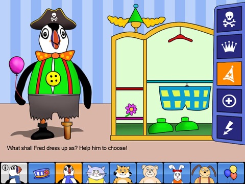 In Fred’s masquerade, you can dress up Fred and all his friends. There are many different costumes to choose from, for example pirate, clown or princess clothing.