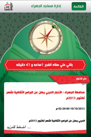تطبيق يتيح لك معرفه مواقيت الصلاه، القبله، اخبار، وتطورات مساجد محافظه الجهراء