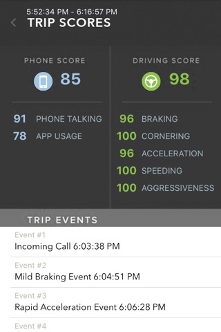 All of these factors affect your driving and phone scores. At the end of each trip, in addition to your scores, you’re sent a route of that trip. Each event that affected your score is marked on the route map, letting you know how you can improve your driving in the future.
