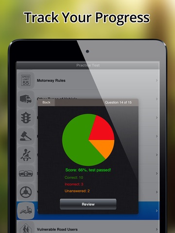Drivio contains 960 multiple-choice questions. All questions are sorted by topic. A summary of the practice test is presented at the end of each test. It shows you the score, which questions you answered correctly and where you were wrong. There is 14 topics: