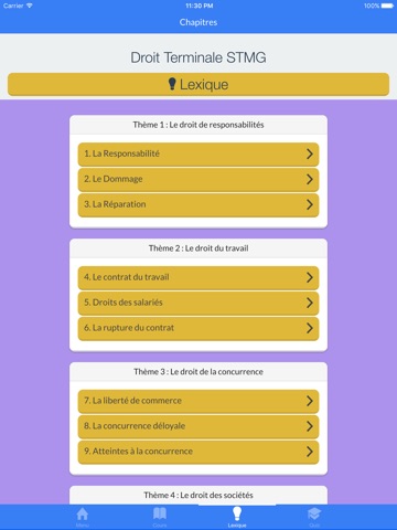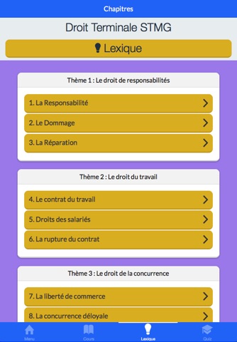 Votre application comporte trois parties : le cours, le lexique et les quiz