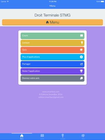 L’application Droit Bac STMG 2016 par Smartbac comporte le nouveau programme de Droit des séries STMG, traité de manière très accessible et claire pour les terminales STMG. Elle est conçue par des professeurs agrégés, des spécialistes de la pédagogie et des membres de jury d’examen.