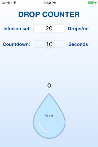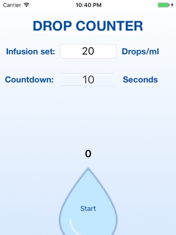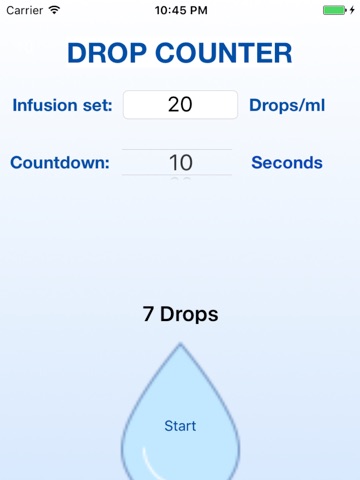 With Drop Counter you will be able to set up the flow rate of a gravity infusion set, easily, and precisely. You could chose your infusion set type, and the countdown time. Just look at the drop falling down and click on your screen. An acoustic signal and a vibration will tell you when the data acquisition is done. The flow rate is then calculated. To increase accuracy, chose a higher countdown time.