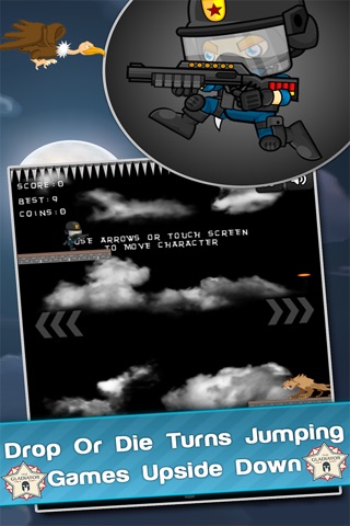 Maneuver your character downwards (Drop) from the rising platforms that increase in speed to move you up into the deadly spikes (Die) whilst avoiding enemies along the way to achieve a high score. Each platform that you successfully pass and stay alive will earn you 1 point.
