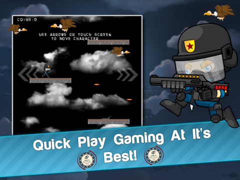 Collect coins scattered across the game to unlock characters and/or enable continue to boost your score (10 coins earns you the ability to continue). Collect the Time Warp symbol to ‘Slow Down’ the velocity of the game for a limited time. You can also gain additional coins as reward for killing enemies, each enemy kill is worth 1 coin.