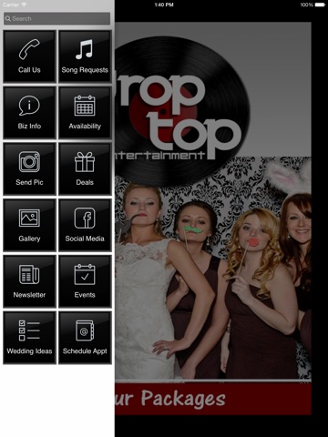 Drop Top Entertainment presents you this mobile app which makes it easy to check availability for your event, contact us, and even send song requests!
