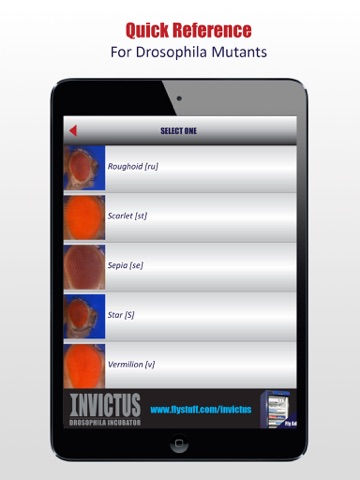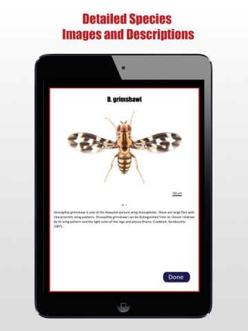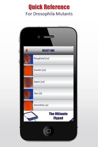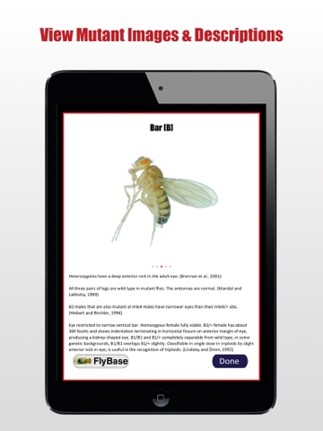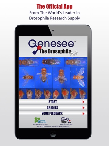 Genesee the Drosophila App provides users with a quick reference to a variety of Drosophila melanogaster mutants. Users can access mutant images and descriptions and can easily link to www.flybase.org for complete and detailed information on specific mutants. Along with providing a reference to D. melanogaster mutants, this app features detailed images and descriptions of various Drosophila species.