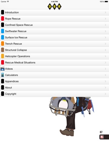 This app covers Rope Rescue, Tree Rescue, Technical Rescue, Swift Water Rescue, Mountain Rescue, Confined Space Rescue, Helicopter Rescue, Structural Collapse Rescue, Rescue Medical procedures, and FEMA and NIMS ISC for disaster incident command.
