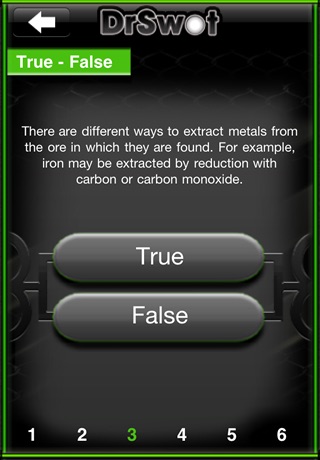 • True-False tests – Review 6 statements and select whether you think the statement is true or false. The app will tell you when you select an incorrect answer, giving you an explanation if the statement is incorrect. You can revisit all 6 statements after the test.
