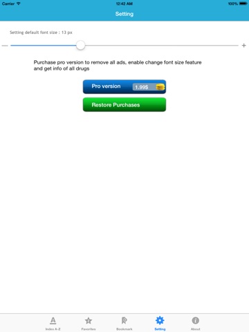 I bought the pro version of this app to have access to the missing drugs I searched for on the Free Version. However, after paying $1.99 for the Pro version, I still cannot find all of the medications I needed! Missing medications or really bad app! Their description says ALL medications are listed but you cant count on this app as a drug guide unless you only search what they have on their list. Pro version not worth it.