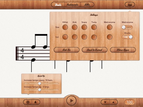 Drum Beats for Beginners is a library of basic beats, rudiments and fills for beginning drummers. You can easily learn and practice rock and funk drums or build your hand speed and accuracy with automatic Speed Up functions. Customize the sound of your in-app drum kit with one touch.