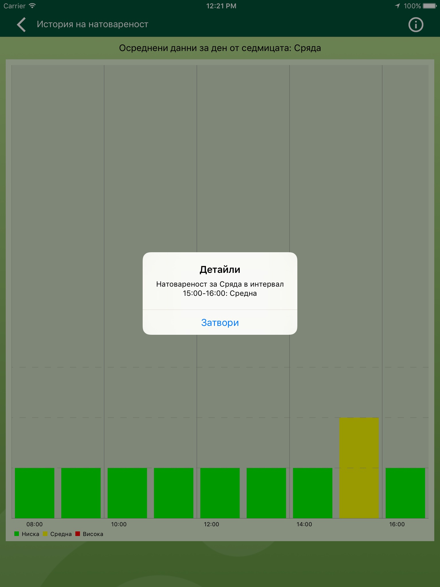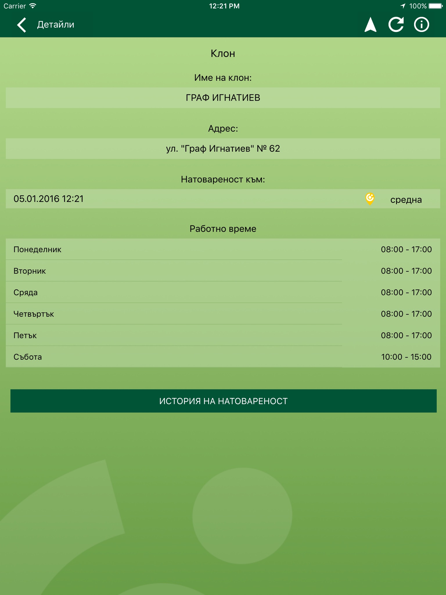 При тапване върху клона се показва допълнителна информация - име, адрес, работно време, степен на натовареност и час на актуализация на данните.