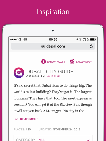 This app covers all the bases and does it well. Very simple and easy to use yet full of pertinent information. I used it continually while in Dubai and as a result, feel that I really got to see the best of everything. I would definitely download more travel apps from Guide Pal.