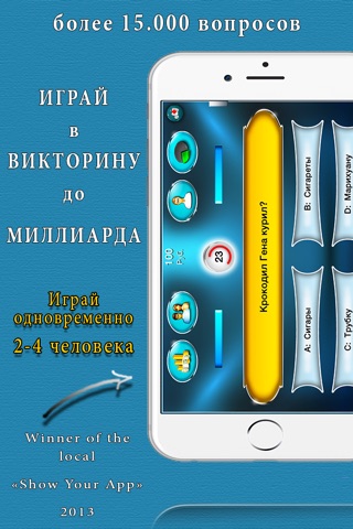 iPhone and iPod game with standard multiple choice questions. In order to win the grand prize of millions game rubles, you must correctly answer 15 questions from various fields of expertise on the highest level of the game.