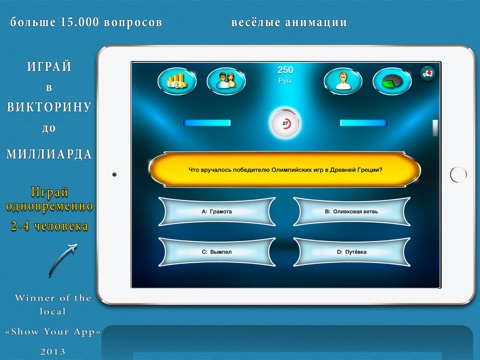 Викторина для iPhone & iPad. Для того, чтобы выиграть главный приз, т.е. миллионы игровых рублей, необходимо правильно ответить на 15 вопросов из различных областей знаний на сложном уровне игры.
