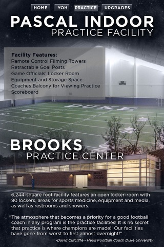 You will have a guided video tour of the Yoh Football Center, heartbeat and nerve center of the entire Duke program. Viewers will get an inside look at this elite $22 million facility nestled in the northeast corner of Wallace Wade Stadium. Other pages of content, photos and video can be found on the latest crown jewel of the Duke program, the Pascal Indoor Facility, as well recent additions to the Brooks Practice Facility and the team locker room.